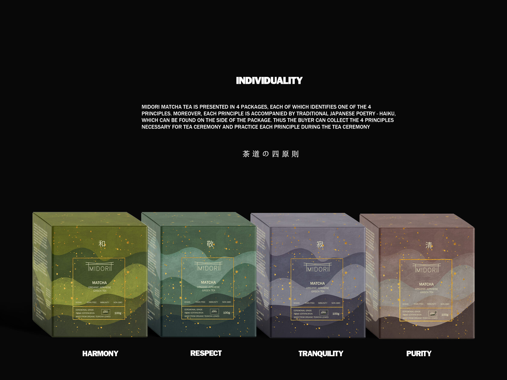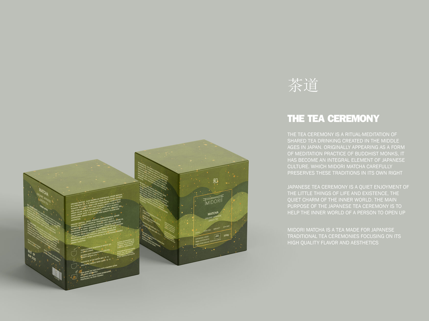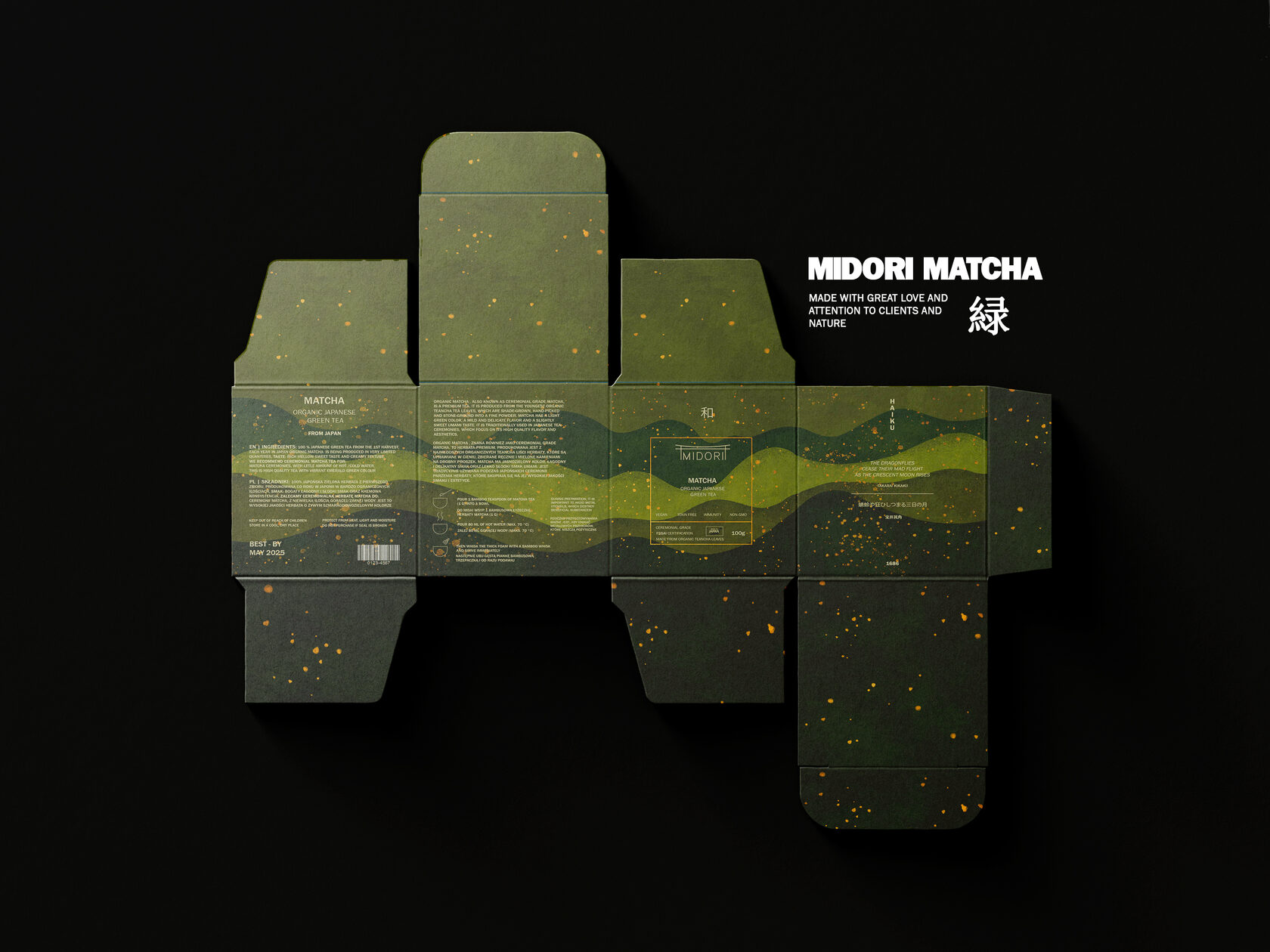 Midori Matcha was a project that required a great deal of time, imagination, and dedication. The goal was to create premium packaging inspired by Japanese traditions, combining elegance, authenticity, and modern aesthetics. A lot of care and attention went into every detail to make the product stand out on the shelf, ensuring that each side of the packaging could capture the customer’s interest and reflect the calm, sophisticated essence of the brand